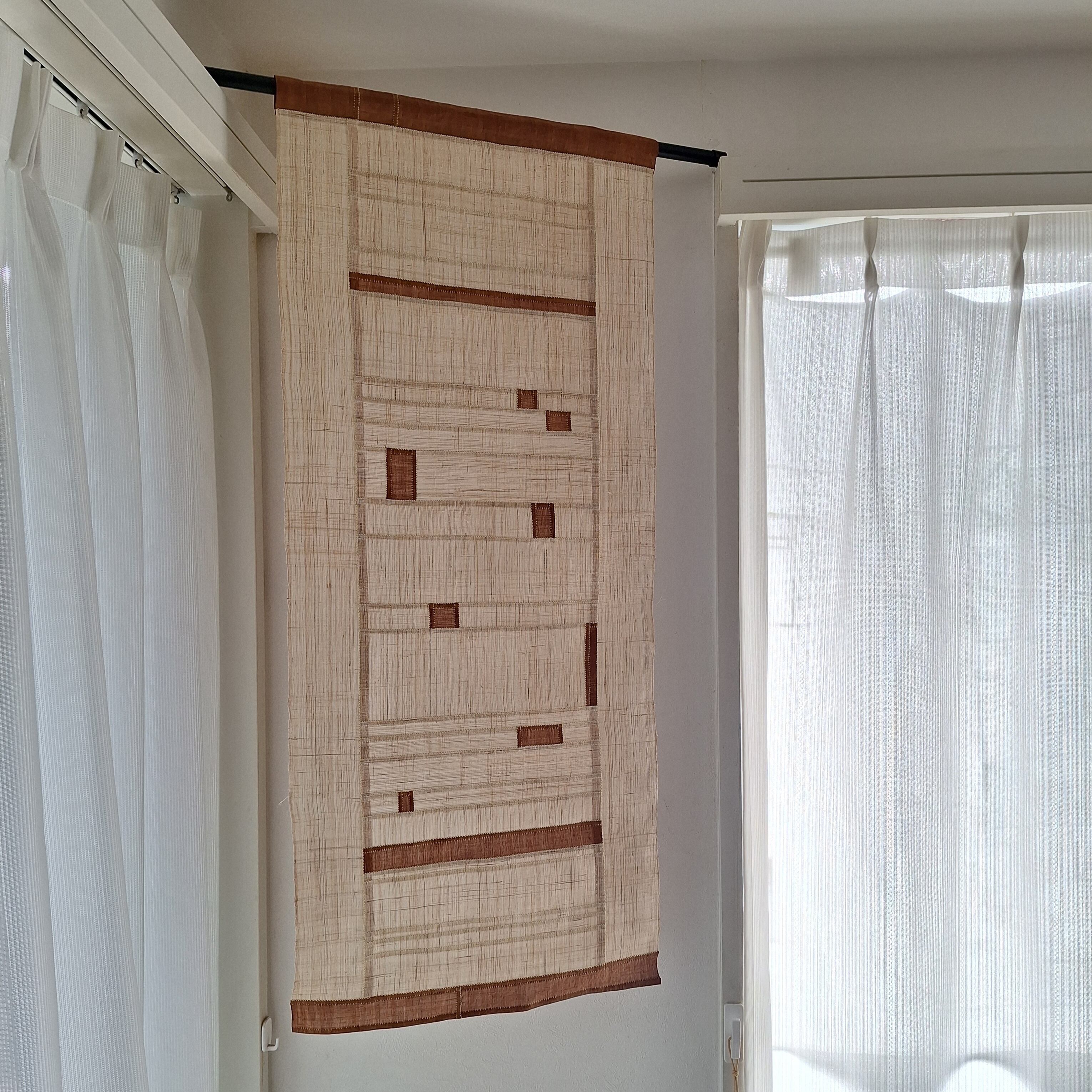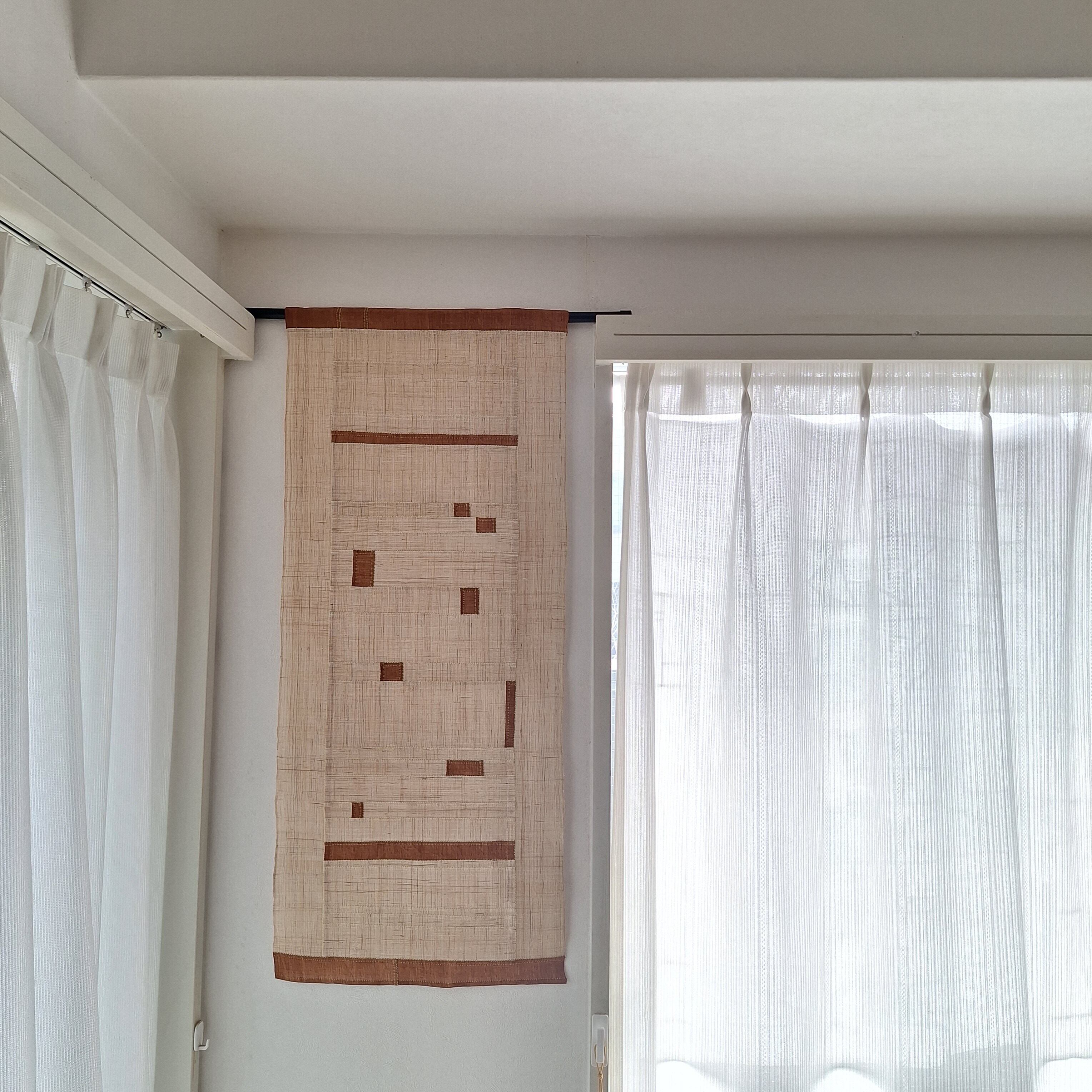 片側の端に棒を通せるように仕立てていますので、のれん棒や突っ張り棒を使って間仕切りや目隠しとして、またタペストリーとして絵画のように壁を飾るのも素敵です。インテリアのアクセントにいろんな使い方が出来ます。